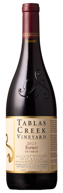 The 2023 Esprit de Tablas is a charming, nuanced homage to Châteauneuf du Pape, made in Paso Robles by Tablas Creek. As their flagship red blend, it consistently impresses, never failing to rate at 96 points or greater in our 11 years of evaluations. It is crafted from a blend of 33% Mourvedre, 31% Syrah, 26% Grenache, 6% Cinsaut, 2% Counoise, and 2% Vaccarese. The blend changes from vintage to vintage, but Mourvedre always leads the Esprit de Tablas, even though it is just 33% (the lowest we have seen) of the blend this vintage. The 2023 vintage started with our wettest winter on record, which replenished groundwater and delayed budbreak. It was followed by the coolest growing season in over 10 years. The Esprit de Tablas grapes were grown on its certified organic and biodynamic estate vineyard. They were fermented with native yeasts in wooden, upright, 1,500-gallon fermenters and closed, stainless steel tanks. The best lots were blended in June 2024 and then rested in 1,200-gallon foudres before bottling in July 2025. This wine will improve with age in the cellar — leave it for at least a decade.